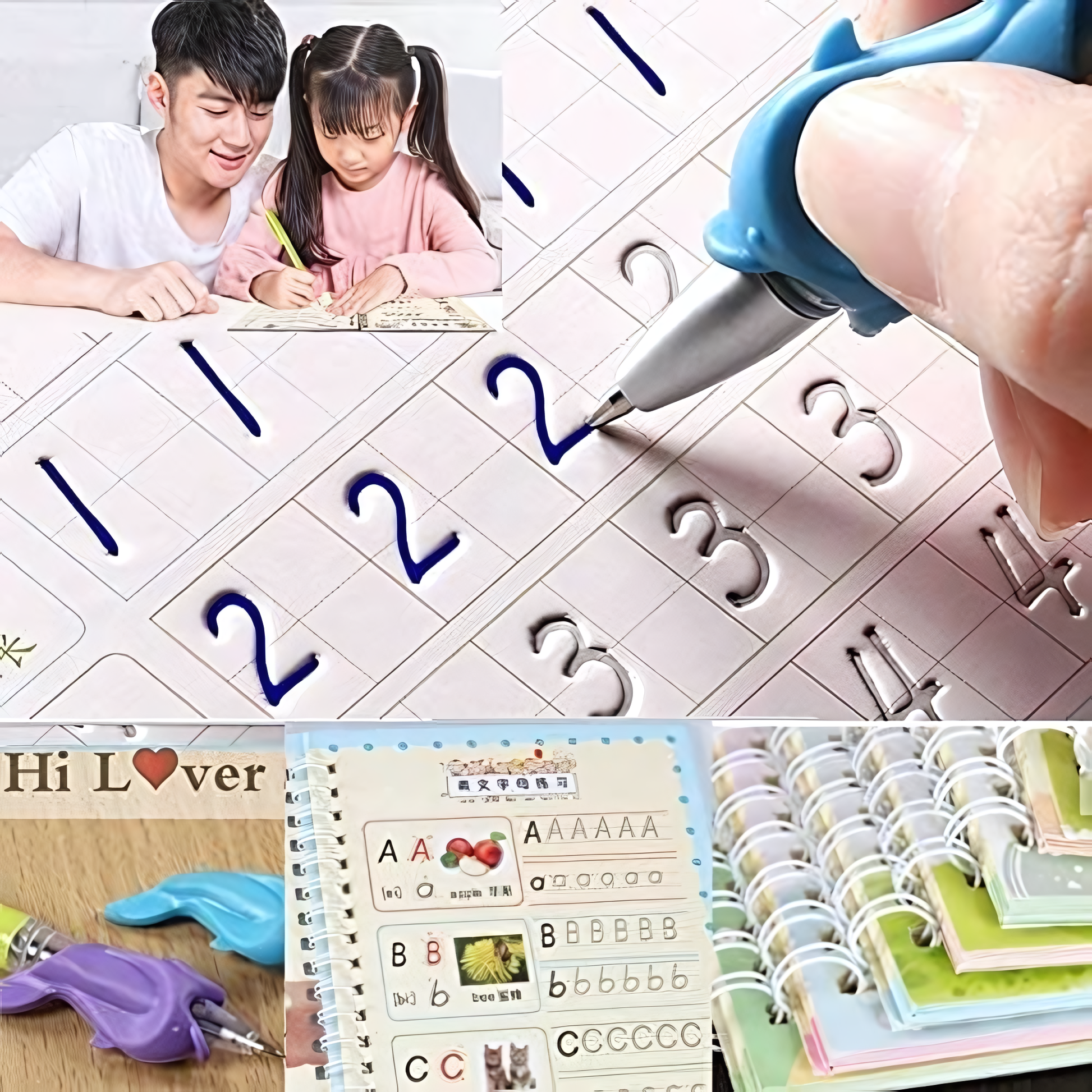 Magic Practice Copybook Set (4 Books + 1 Magic Pen + 1 Grip + 10 Refills) – Reusable Handwriting Improvement Book for Kids